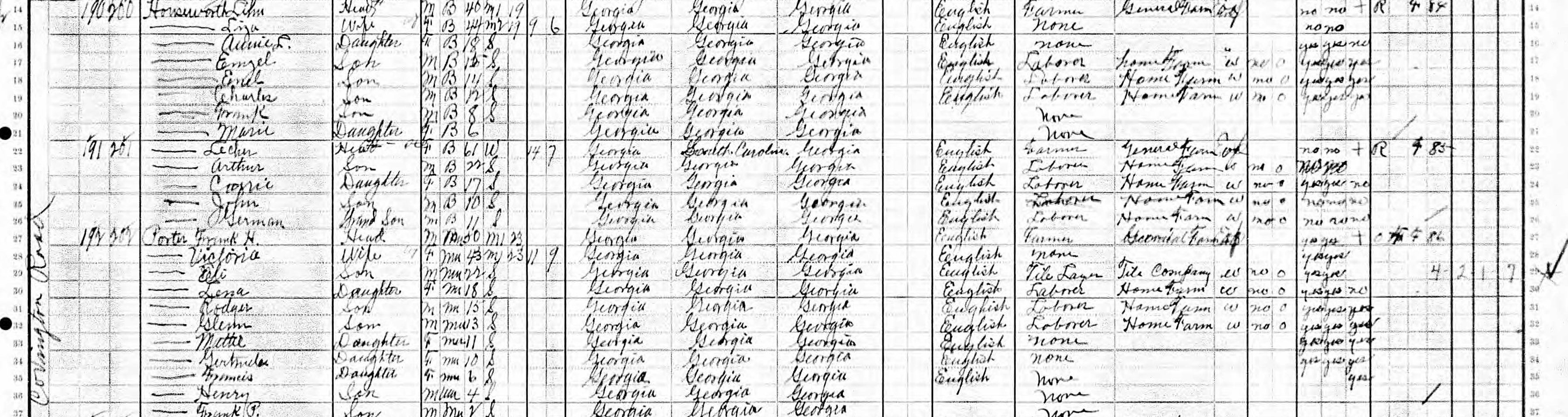 Aaron Houseworth appears as a “Freedman” on the Property Tax Digests for Evans District in 1873 with his father Daniel and a brother, Sampson (Sam).[4] In 1880, at 29, Aaron was a sharecropper on 16 acres of land, paying rent in the form of product.[5] Aaron and Letcher eventually had 11 children, one of whom was Anna, Carl’s mother.[6] Aaron’s eldest, Elihu, farmed in Ingleside along Covington Road. Three of Elihu’s other sons, Frank, NL, and Charlie, worked as trackmen on the Stone Mountain streetcar line and later moved to Detroit as part of the Great Migration.[7] After Aaron’s death Letcher stayed close to her sons. In 1910 she was living next to Elihu on Covington Road. Elihu Houseworth’s neighbors on Covington Road in 1910 included Frank Henry Porter, his wife, and 8 children.